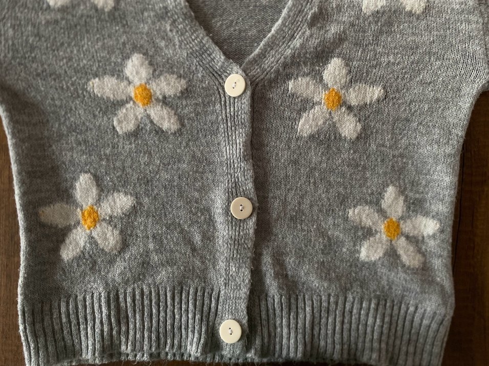 Gri renkli, nakışlı çiçek desenli düğmeli hırka. Yaka detaylı, uzun kollu ve midi boyda, rahat bir kesime sahiptir.