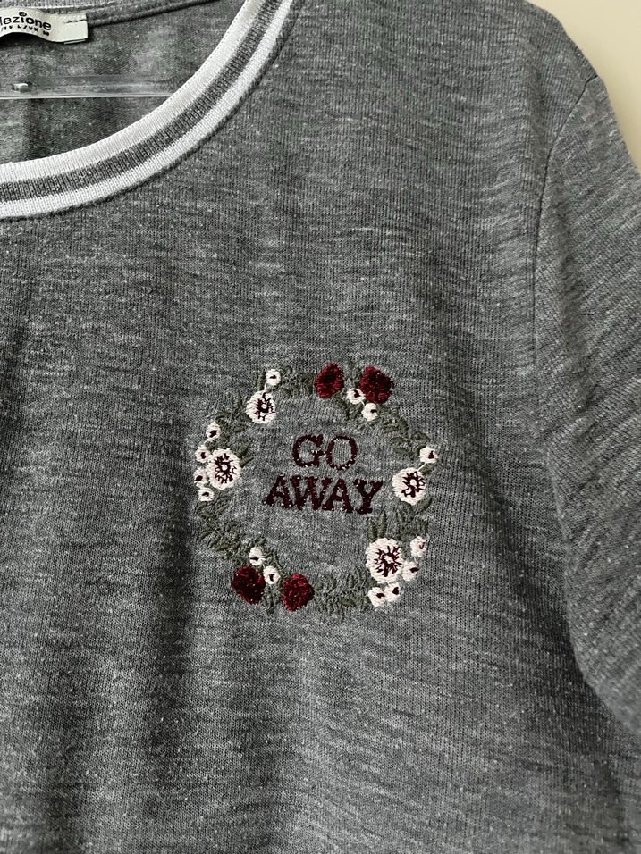 Gri pamuklu tshirt, yuvarlak yakadır. 'GO AWAY' yazısı etrafında nakışlı çiçek deseni vardır. Günlük kullanım için uygundur.