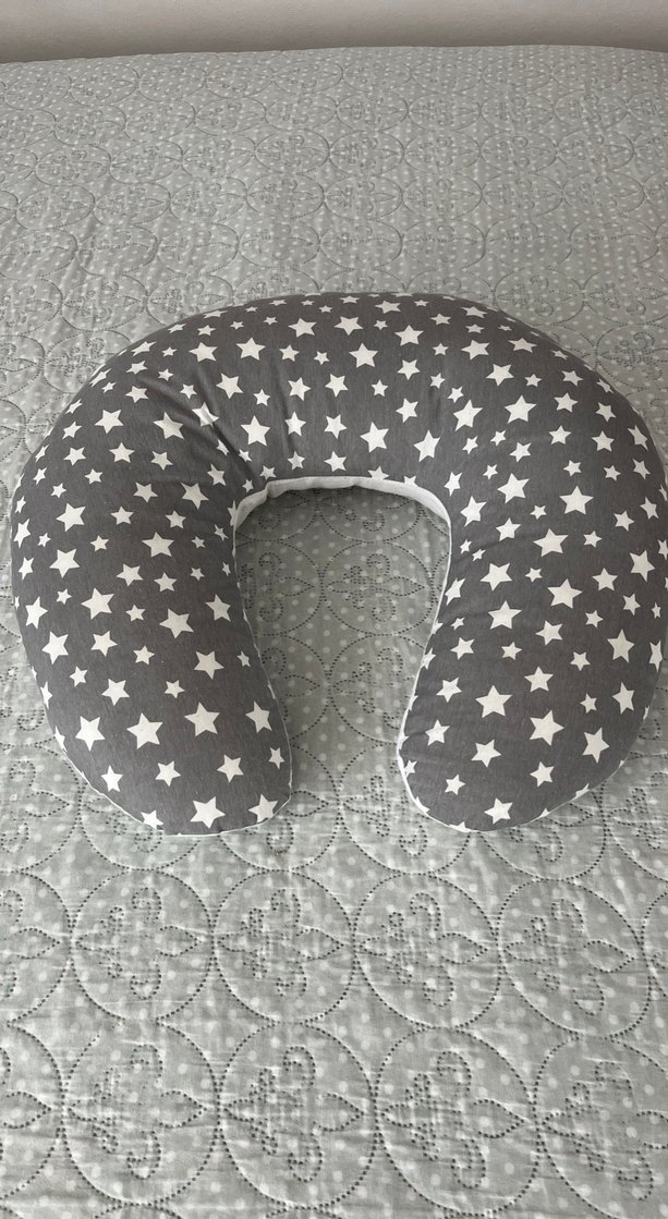 Gri renkte, nakışlı yıldız desenli hamile ve emzirme yastığı, destek ve rahatlık sağlar. ⭐