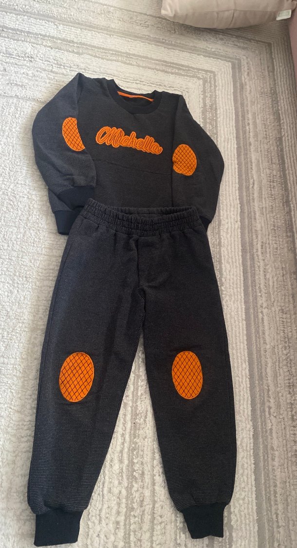 Gri renkli, uzun kollu ve bisiklet yaka örme kumaştan yapılmış erkek bebek eşofman takımıdır. Dirsek ve dizlerde turuncu nakışlı detaylar bulunur.