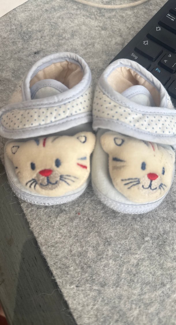 Beyaz ve gri nakışlı, yumuşak kürk detaylı erkek bebek ev patiği, rahat sokak stili için uygundur.