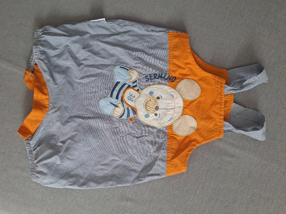 Gri renkli, nakışlı ayıcık desenli kolsuz erkek bebek tulumu. Düğmeli ve yumuşak sentetik kumaştan, sokak stili için uygun.