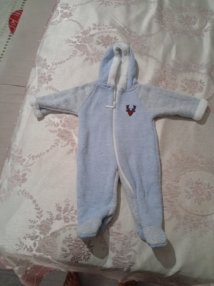 Gri renkli, nakışlı detaylara sahip, triko örgü yapısında ve yumuşak tüylü kumaştan erkek bebek tulumu, sokak stili için uygundur. ❄️ yumuşacik pamuklu asla terletmez sağlıklı kumaş sadece bir kere kullanabildik çabuk büyüdü 3 6 ay uygun