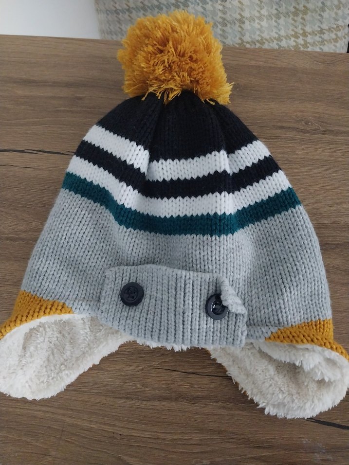 Gri tonlarda nakış detaylı, sarı ponponlu, içi yumuşak sıcak kumaşla kaplı erkek çocuk bere. 6-10 yas