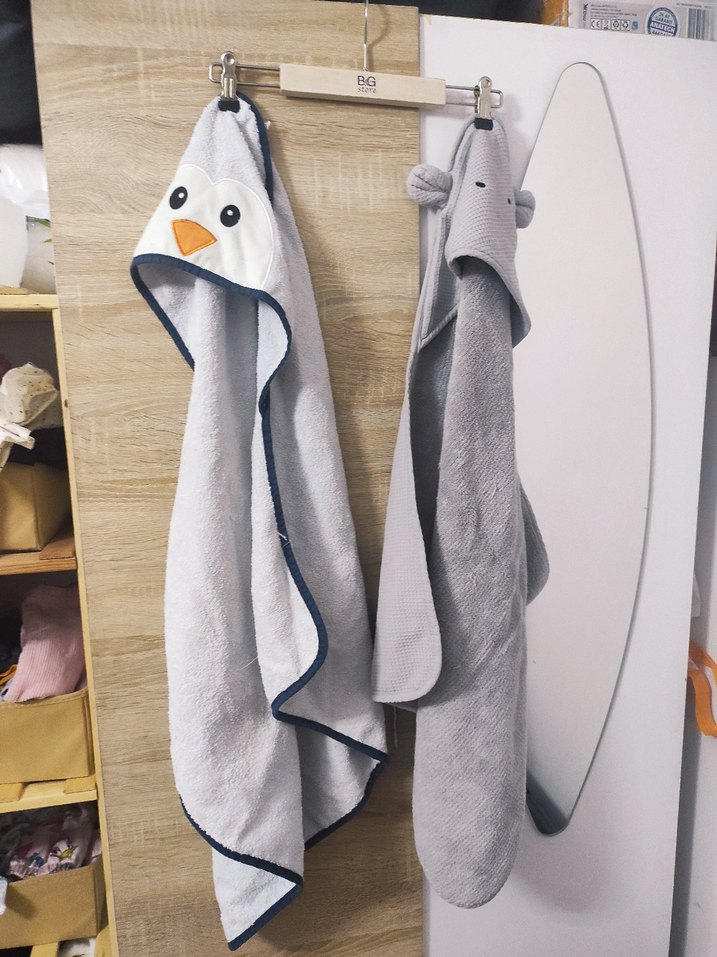Nakışlı detaylı gri kapüşonlu bornoz ve havlu seti. Havlunun kapüşonunda gözler ve turuncu gagalı hayvan figürü bulunur. Bornozun kapüşonunda küçük kulaklar vardır. Yumuşak ve rahat dokuda. ıkısıde az kullanıldı