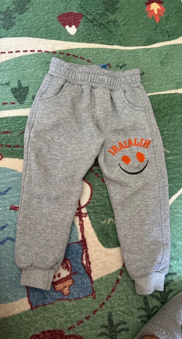Yumuşak ve sıcak kumaştan yapılmış, bol kesim gri erkek çocuk eşofman altı. Nakışlı gülen yüz ve "IRAIALIH" yazısı ile birlikte, fermuarlı ceplere sahiptir.