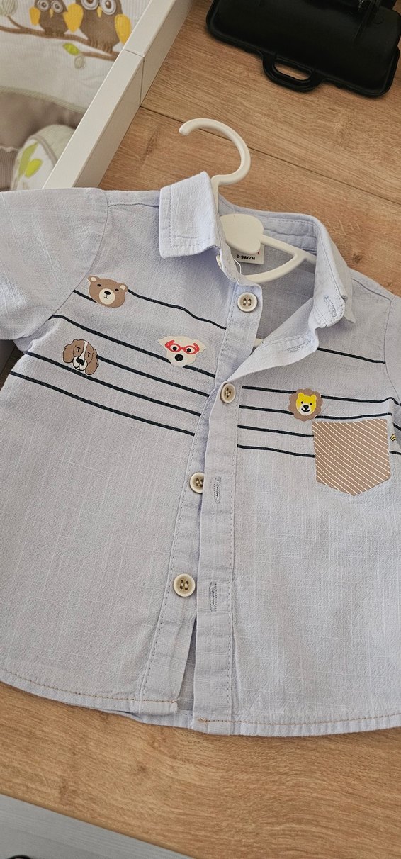 Pamuklu kumaştan, gri renkli kısa kollu erkek çocuk gömleği. Nakışlı hayvan desenleri ve çizgili cep detaylarıyla sokak stili sunar.