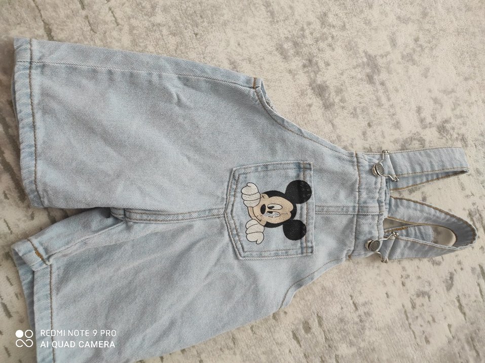 Gri kot kumaştan, düğmeli ve nakışlı Mickey Mouse desenli, kısa kollu, bol kesim erkek çocuk salopeti. Sokak stili için uygun.
