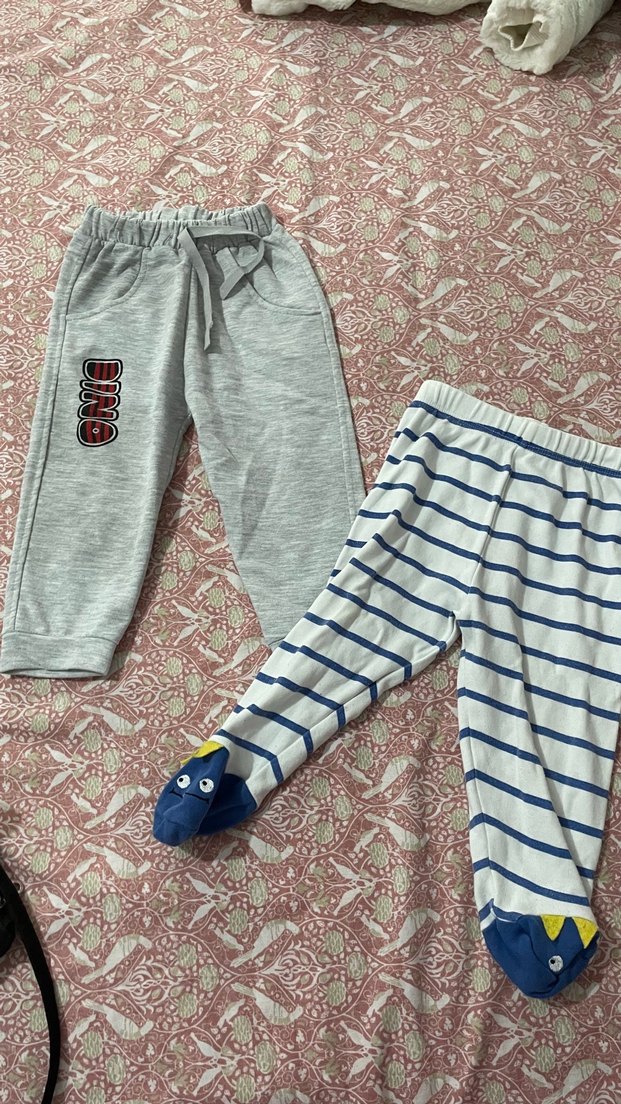 Yumuşak pamuklu kumaştan, gri nakışlı ve örme dokulu, rahat kesim erkek çocuk pantolonu. Sokak stiline uygun. İkili 60 tl 9 ay 1 yaş uyumlular