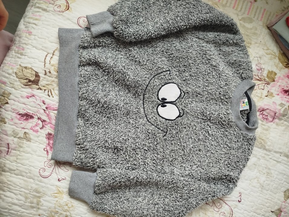 Gri, nakışlı ve kürk detaylı, yuvarlak yakalı, uzun kollu, bol kesim erkek peluş sweatshirt.