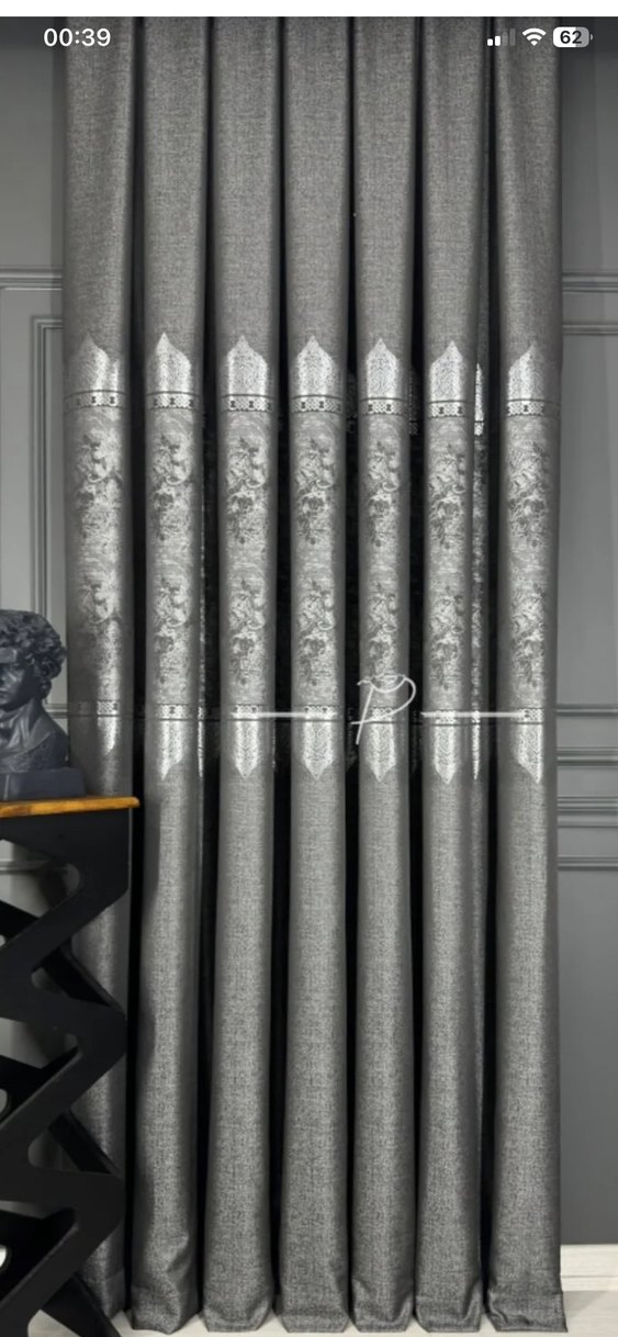 Gri renkte, nakışlı desenlere sahip geleneksel tarzda bir perde. Odaya zarif bir dokunuş katıyor.