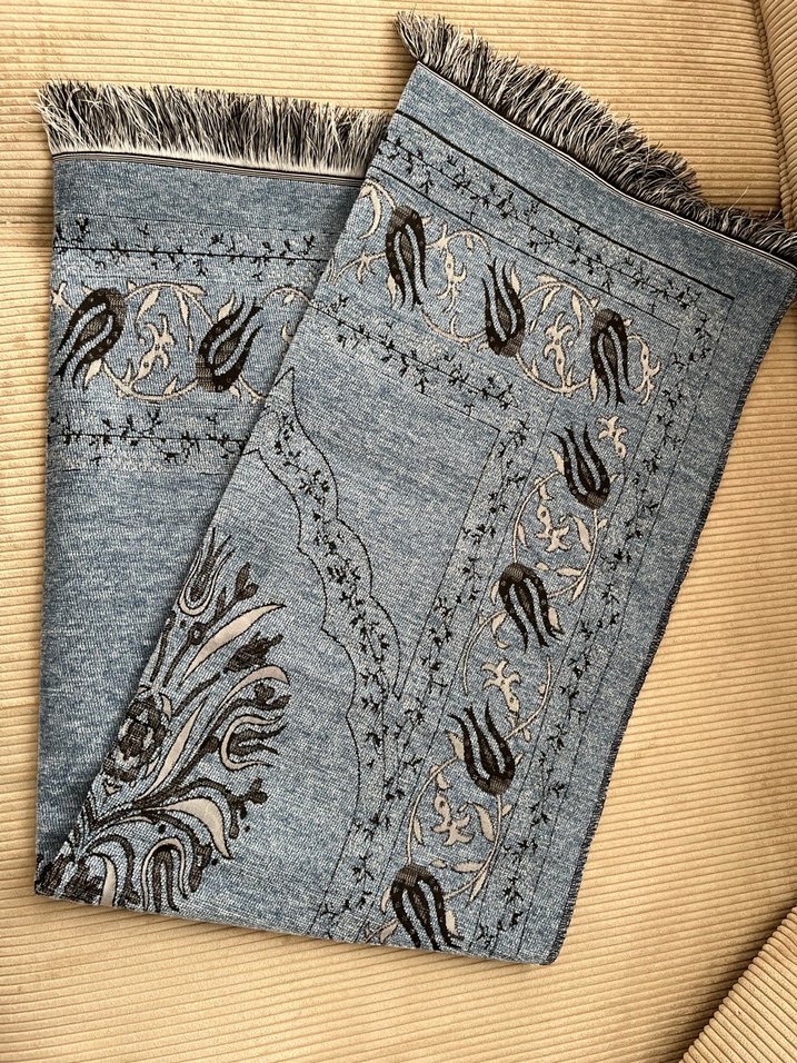 Gri mavi tonlarda, nakışlı desenlere ve püsküllü kenarlara sahip geleneksel tarzda namazlık