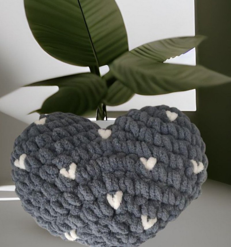Gri renkte, yumuşak dokulu kumaştan yapılmış, beyaz nakışlı kalp desenlerine sahip hamile ve emzirme yastığıdır.