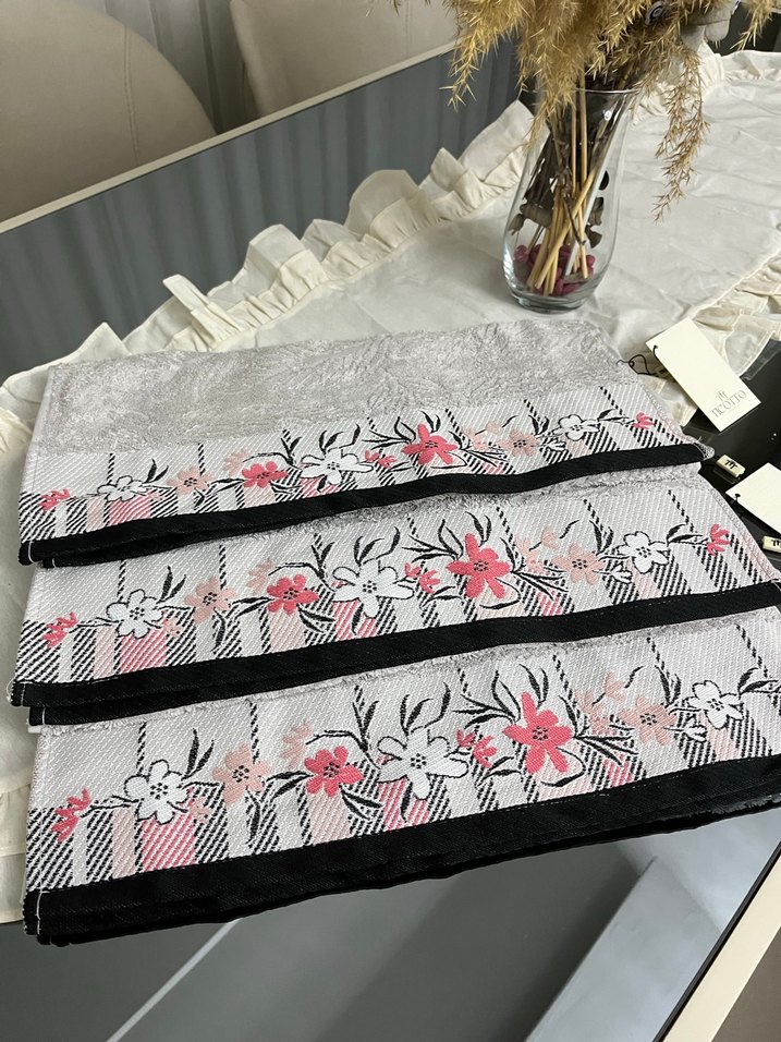 Gri renkli, nakışlı çiçek desenlerine sahip konvansiyonel tarzda, siyah detaylı havlu seti. Dekoratif ve kullanışlıdır. %100 pamuk sıfırdır tek fiyatıdır