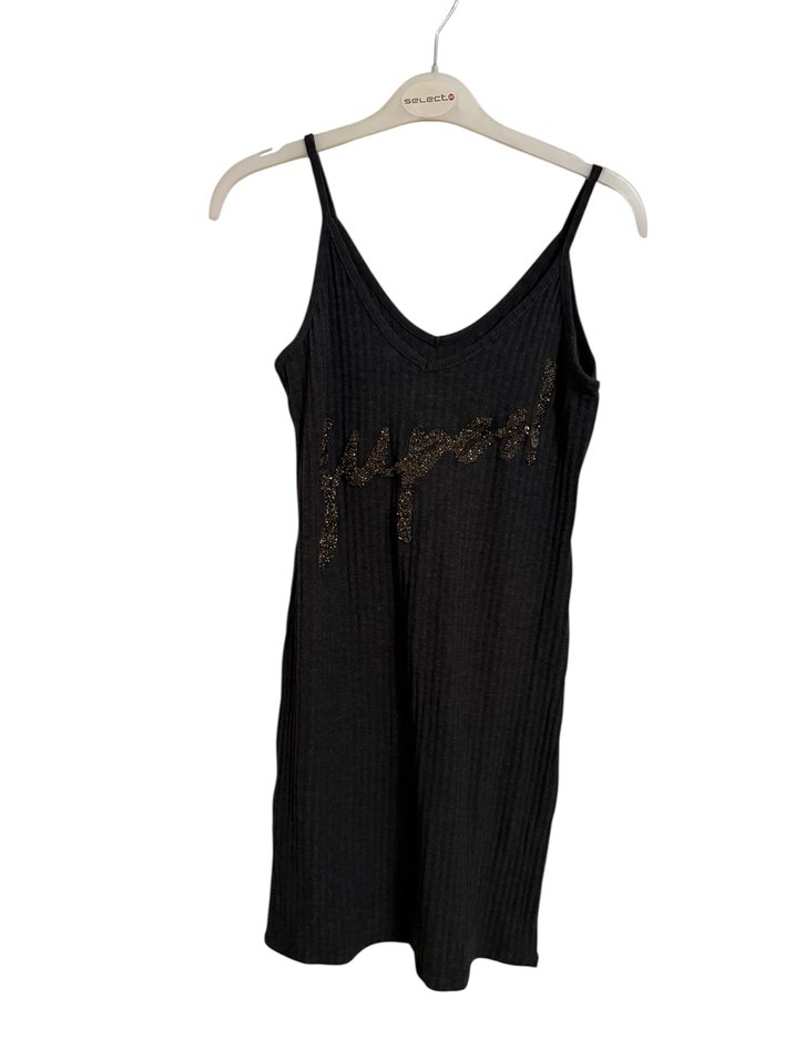 Gri renkli, nakış detaylı, ince askılı, V yakalı, kısa ve fitted kesim örme kumaştan rahat sokak stili elbise. Sadece ünlem işaretinin taşı biraz düştü