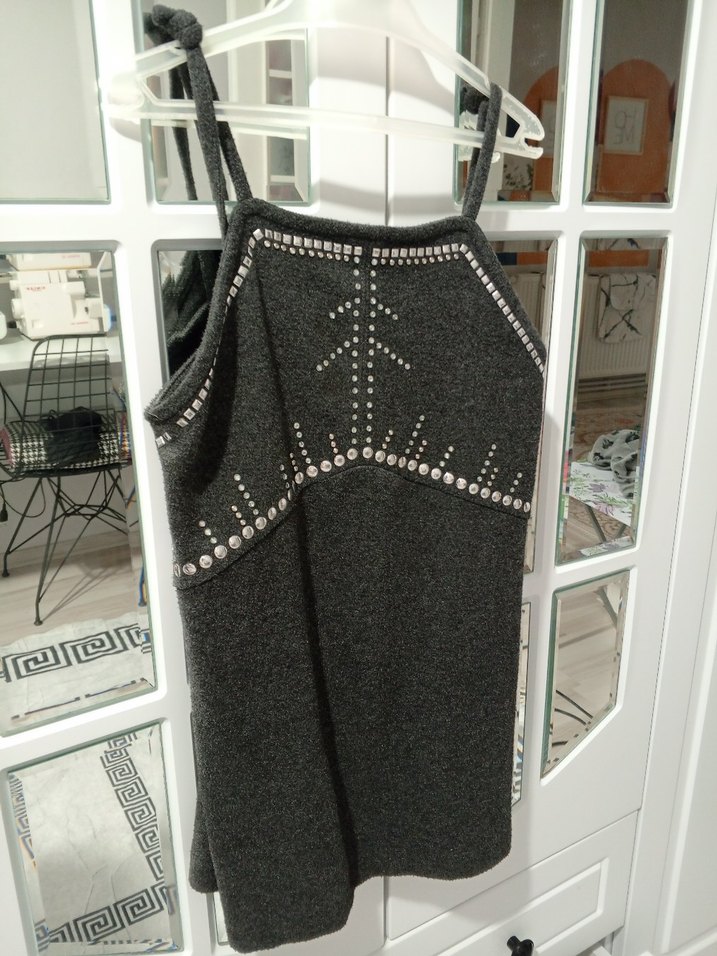 Gri Nakışlı İnce Askılı Triko Elbise
