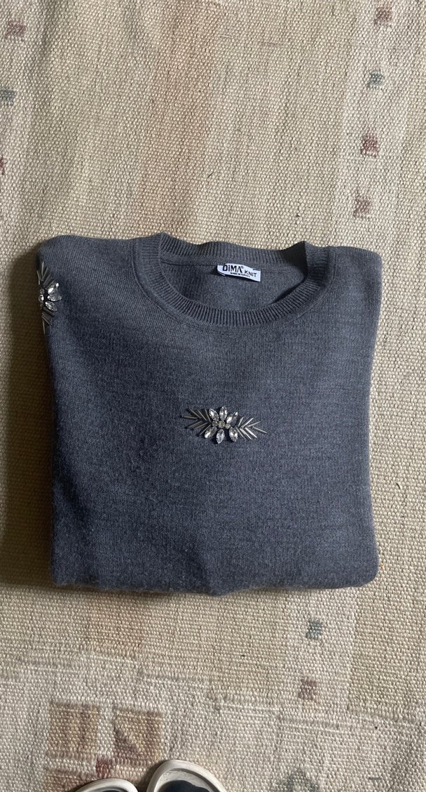 Gri renkte, nakışlı detaylara sahip denim kazak. Yuvarlak yaka ve uzun kolludur, rahat kesimiyle günlük kullanıma uygundur. 2-3 XLİÇİN UYGUNDUR ölçüleri gösterdim fotoğraflarda