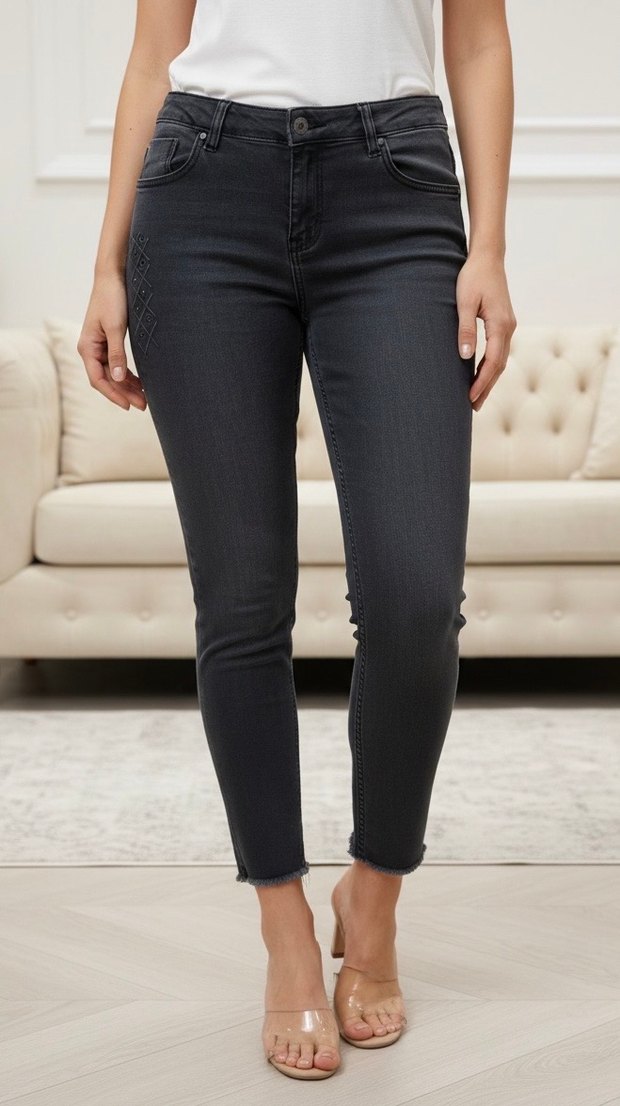 Gri renkte, nakışlı detaylara sahip, kemerli ve normal boyda kadın denim pantolon. Ofis kullanımı için uygundur.
