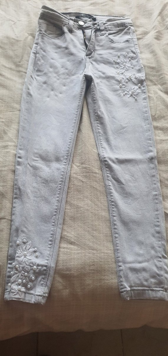 Nakışlı detaylara ve düğmeli kapamaya sahip gri denim pantolon. Normal kesim ve midi boyda, bohem tarzda günlük kullanım için uygun.likralı boy 87cm bel31cm yüksek bel