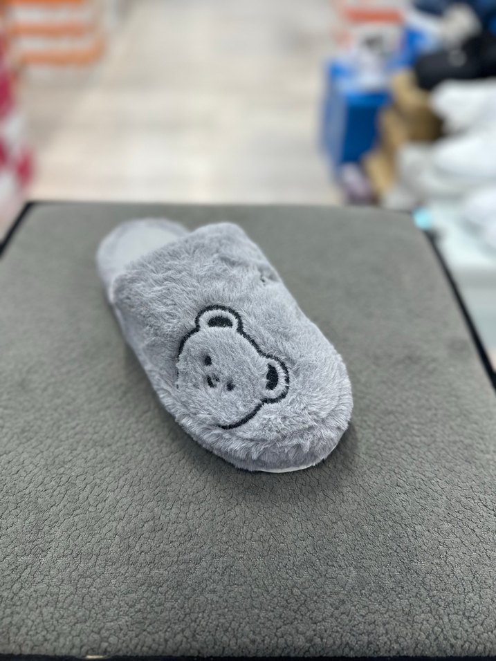 Gri nakışlı ayı desenli, yumuşak kürk detaylı kadın ev terliği. Günlük kullanıma uygun, dolgu topuklu ve rahat bir yapıya sahip.