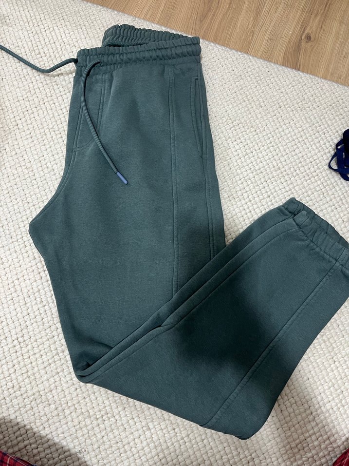 Gri keten kumaştan, nakışlı ve fermuarlı cepli, rahat kesimli kadın eşofman altı. Günlük kullanıma uygun, şık ve konforlu.