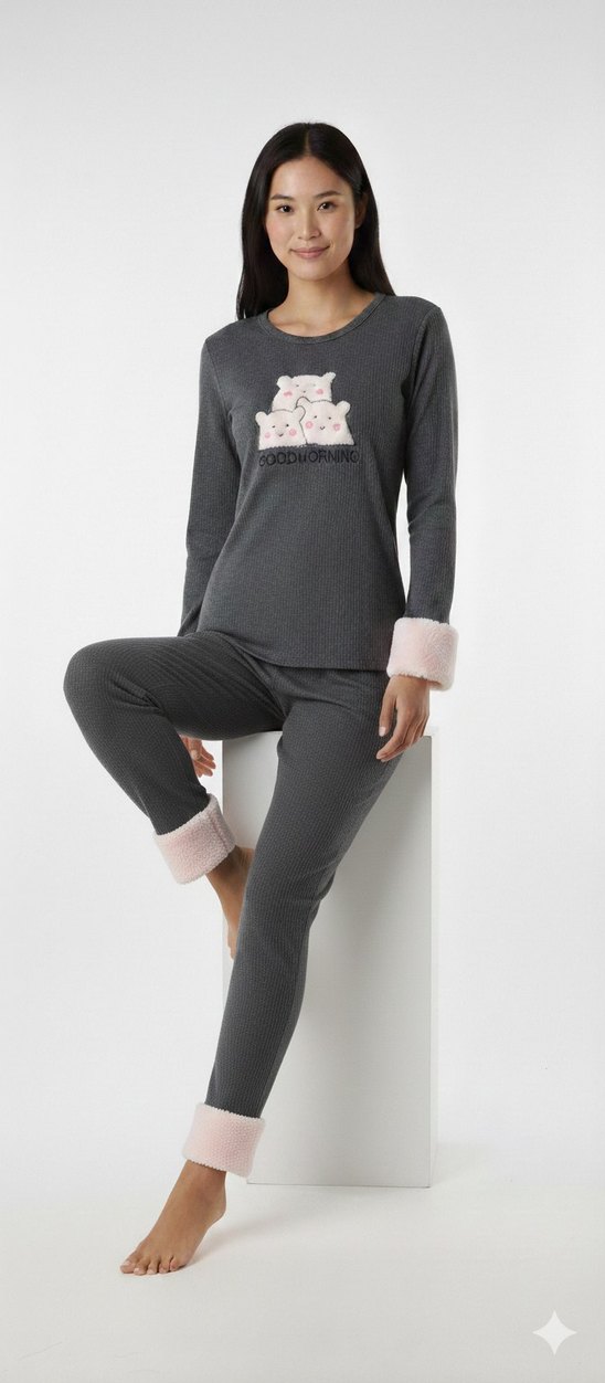 Gri renk, uzun kollu ve nakışlı ayı desenli bol kesim kadın pijama takımı. Kollar ve paçalarda yumuşak pembe manşetler bulunur. Midi boy, rahat ve konforlu.