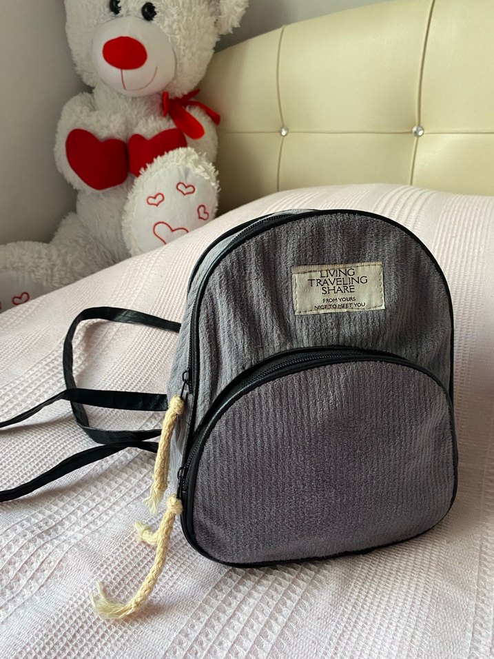 Gri renkli, nakışlı desenli ve fermuarlı bölmeleri olan sentetik kumaştan kadın sırt çantası, günlük sokak stili için uygundur.