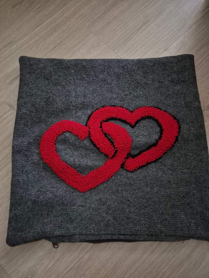 Yumuşak kumaştan, gri renkte ve üzerinde kırmızı nakışlı kalpler bulunan modern tarzda kırlent kılıfı. ️