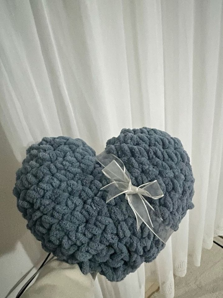 Nakışlı dokulu desene sahip, kalp şeklinde gri yastık. Dekoratif fiyonk ile süslenmiş, yumuşak ve rahat tasarım.