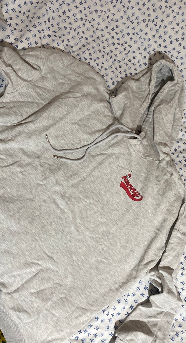 Pamuk kumaştan, kapüşonlu ve uzun kollu, bol kesim gri kadın sweatshirtü. Nakışlı deseni ve fermuar detayına sahiptir. Günlük spor şıklığı için uygun.