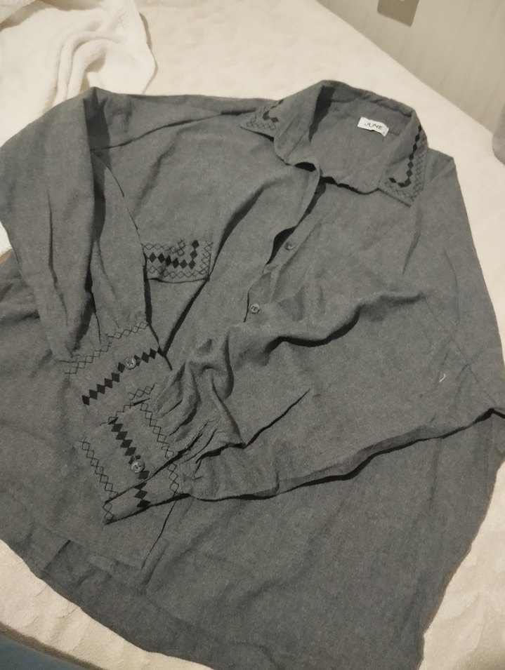 Gri keten gömlek, nakışlı detaylar, uzun kollu, düğmeli ve yakalı. Rahat kesimiyle günlük sokak stiline uygun.
