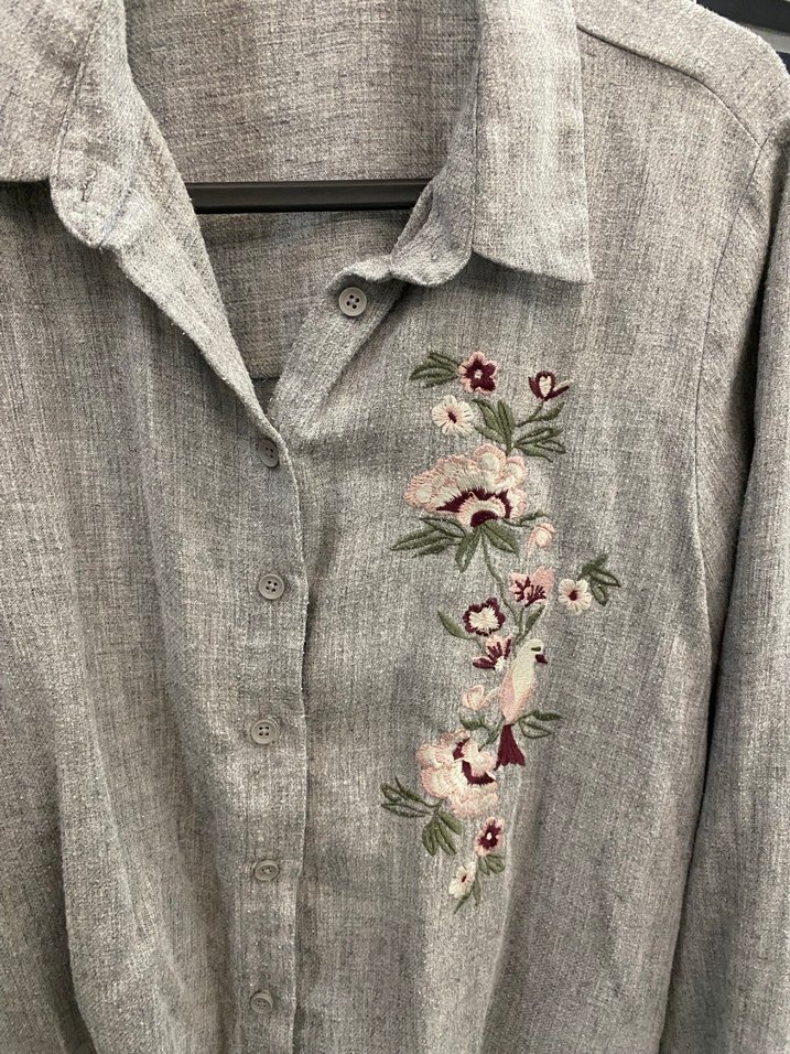Gri keten kumaştan, yakası kesik ve düğmeli, uzun kollu, bol kesim kadın gömlek. Nakışlı çiçek detaylarıyla vintage ve bohem tarzı bir arada.