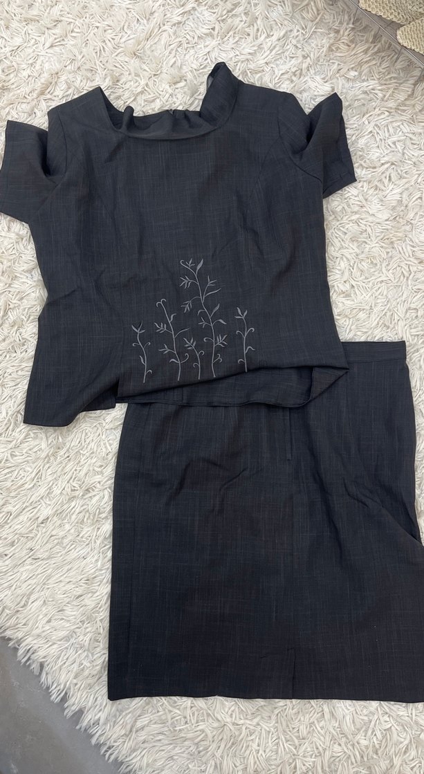 Gri keten kumaştan, kısa kollu, uzun kesim ve regular fit kadın takımı. Tekne yaka ve nakışlı detaylarla ofis için uygun şık bir seçim.