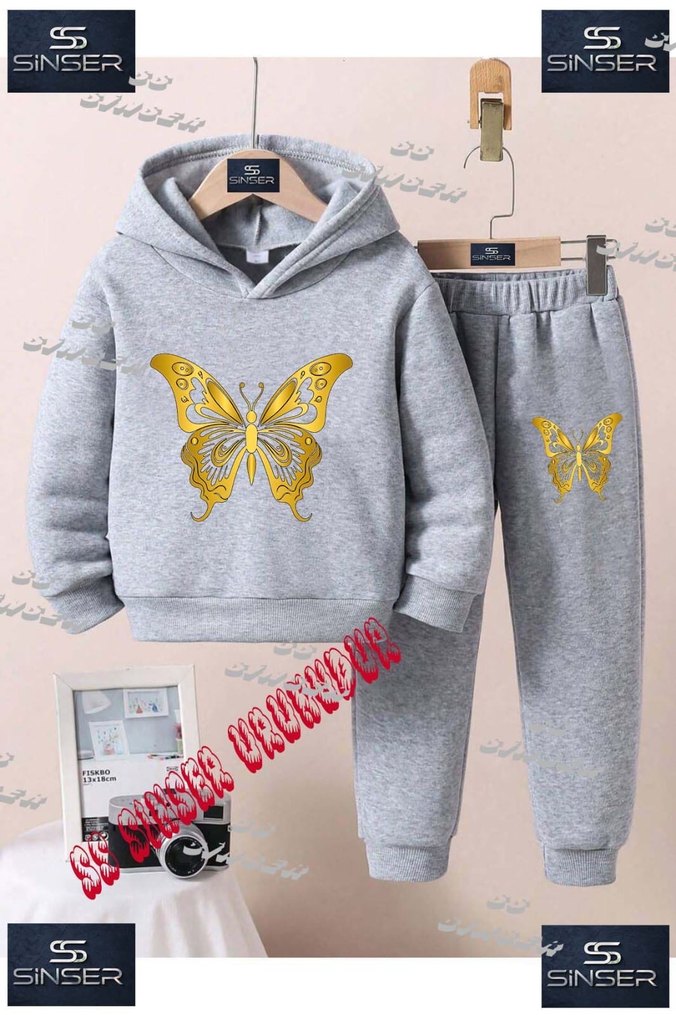 Gri renkli, nakışlı ve payetli kelebek desenli, bol kesim erkek çocuk eşofman takımı. Yumuşak kumaştan, kapüşonlu üst ve lastikli pantolonlu Sinser ürünü.