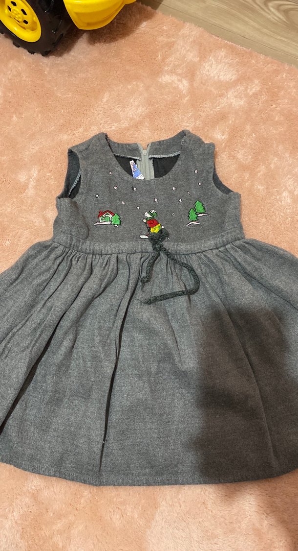 Nakış detaylı düğmeli, kolsuz gri kız çocuk elbisesi. Yumuşak ve sıcak kumaştan, bol kesim ve askısız yakalıdır. Rahat sokak stili için uygundur.