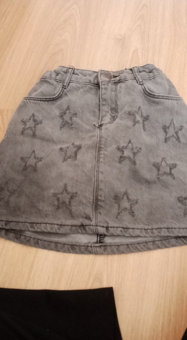 Nakışlı yıldız desenli, düğmeli gri kız denim eteği, rahat kesim. Sokak modasına uygun trendy casual tarzda. ⭐harika desenlere sahip