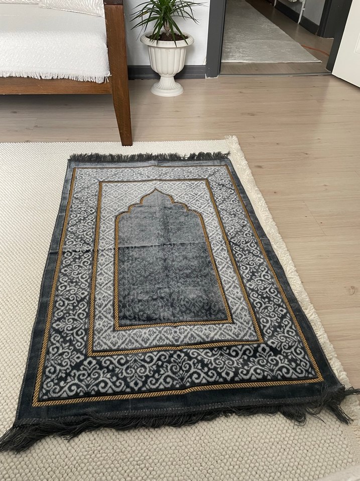 Koyu gri renkte, nakışlı desenlere sahip klasik tarzda bir halı seccade.