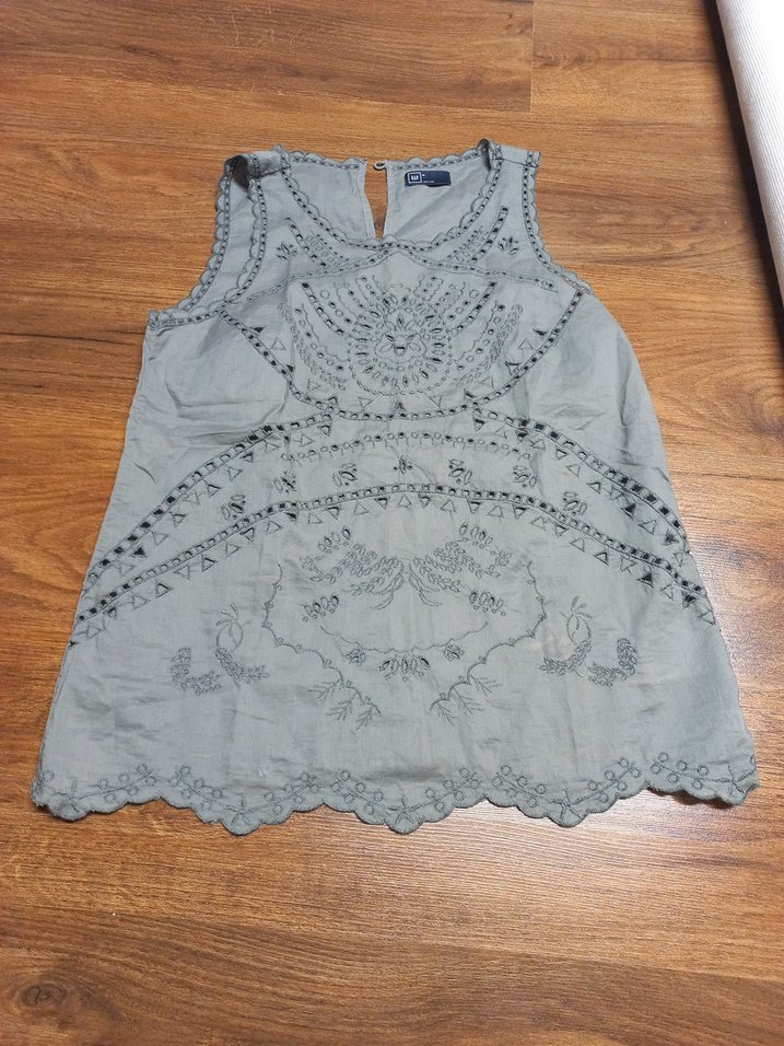 Gri keten kumaştan kolsuz bluz, nakış ve dantel detaylıdır. Salaş kesimi ve yuvarlak yakasıyla bohem tarzı yansıtır.