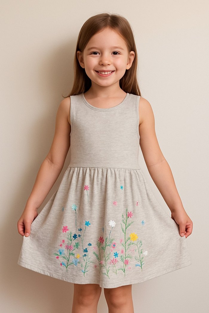 Gri Nakışlı Kolsuz Kız Çocuk Elbisesi
