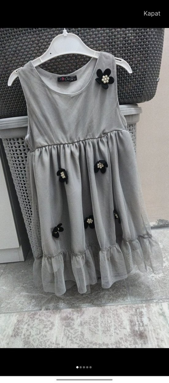 Nakışlı detaylı, bol kesim, kolsuz gri elbise. Yumuşak sentetik kumaştan, etek ucu fırfırlı.