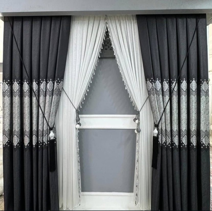 Nakış desenli gri konvansiyonel perde, beyaz iç perde ve dekoratif püsküllerle tamamlanmıştır. 80×260cm aksesuar hediyeli iki adet fon perde