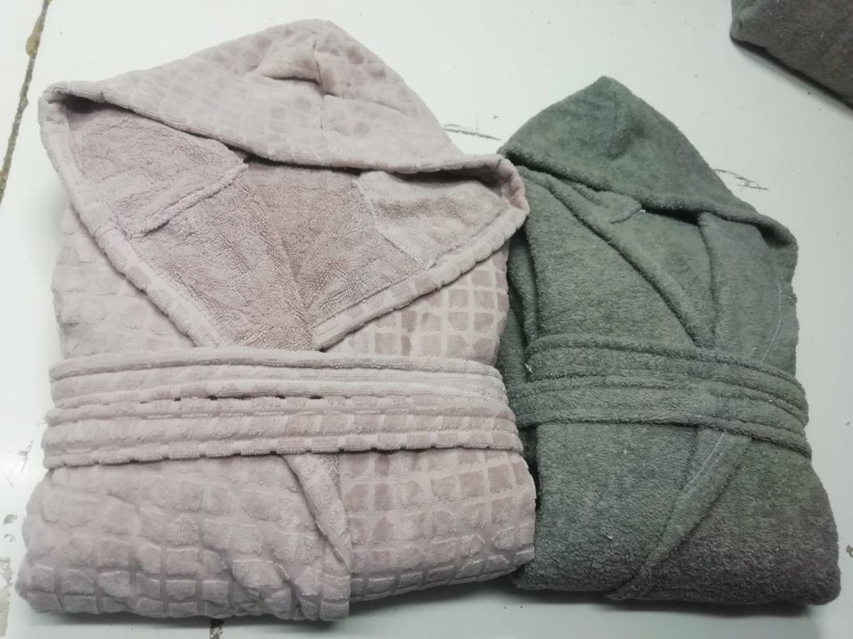 Nakış desenli, gri renkte ve modern tarzda yumuşak dokulu kapüşonlu bornozlar. Bel kemeri ile rahat kullanım sağlar.