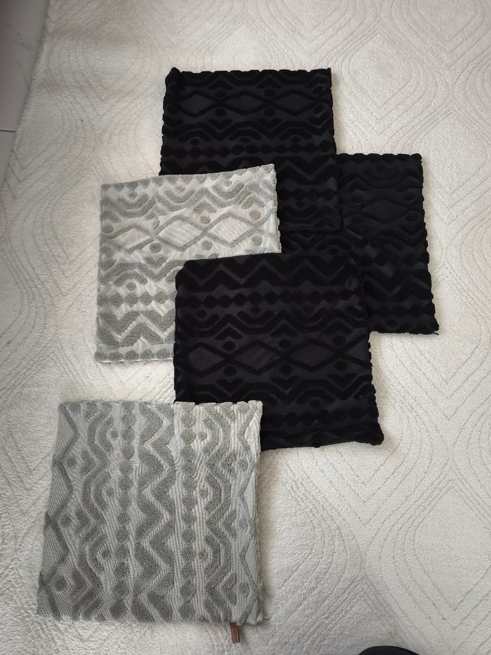 Gri ve siyah tonlarda nakışlı desenlere sahip modern yastık kılıfları, oturma alanlarına dokulu bir şıklık katıyor. ️Hamur marka. 4adet siyah 2adet gri mevcut