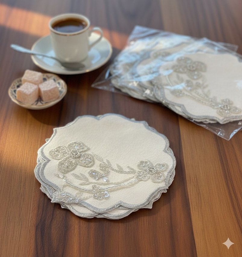 Modern klasik tarzda, gri nakışlı beyaz peçeteler, şık masa düzenleri için uygundur.