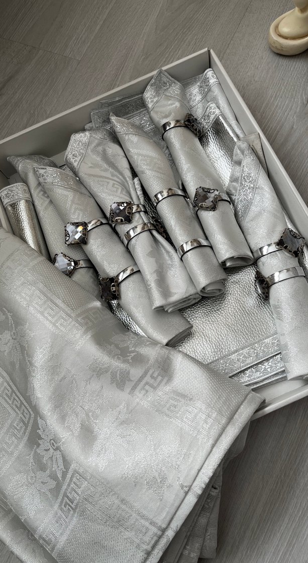 Gri nakışlı peçeteler ve süslü halkalar içeren modern klasik tarzda bir peçete setidir. Kumaş, masa düzenine zarafet katan ince desenlidir. Masa örtüsünde ufak hasar var başka sorun yoktur 6 kişilik masa örtüsü hariç hepsi sıfır