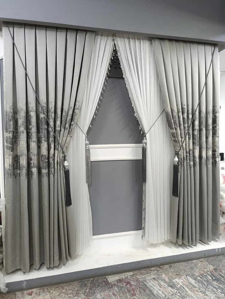 Nakışlı desenlere sahip gri perdeler, dekoratif püsküller ve katmanlı görünümle modern klasik tarzı birleştiriyor. 2 adet aksesuar hediye