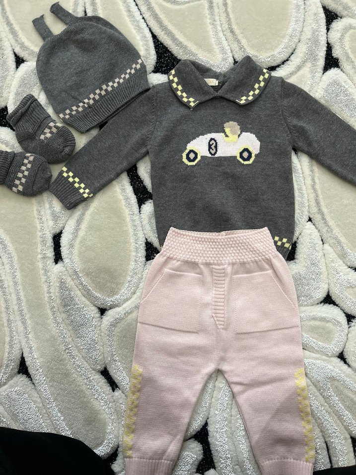 Nakışlı araba desenli uzun kollu gri örgü üst, uyumlu şapka, patik ve yumuşak pembe pantolondan oluşan bebek kız takımı.