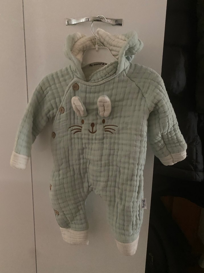 Nefes alabilen keten kumaştan yapılmış yumuşak gri örgü bebek tulumu, nakışlı tavşan yüzü detayları ve kapüşonlu.