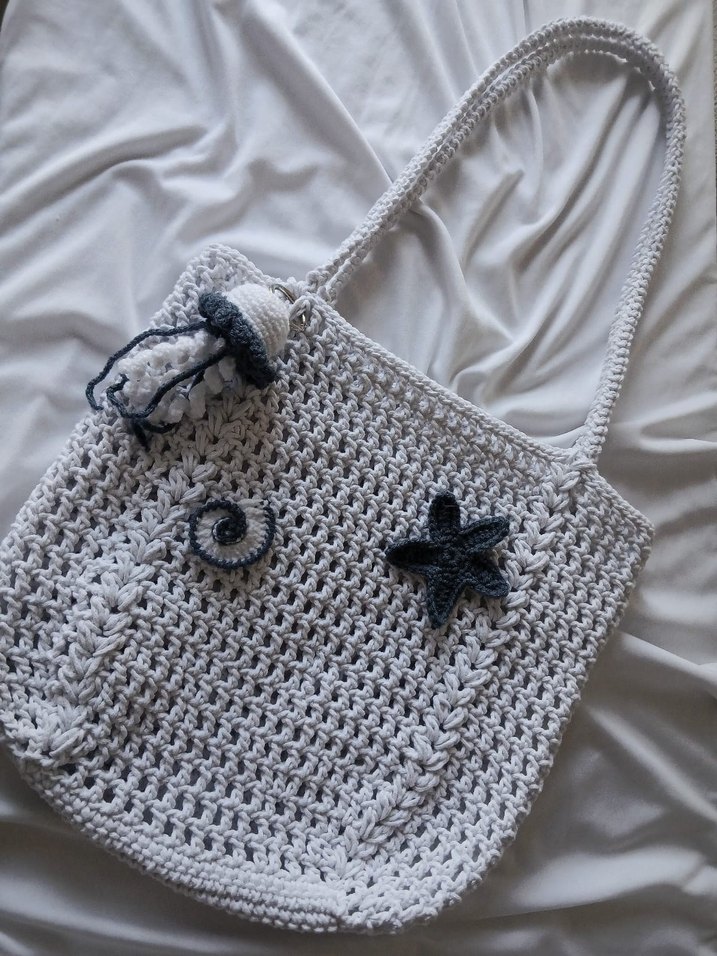 Gri nakış detaylı beyaz örme kadın çantası, bohem ve rahat tarzıyla günlük kullanıma uygundur.