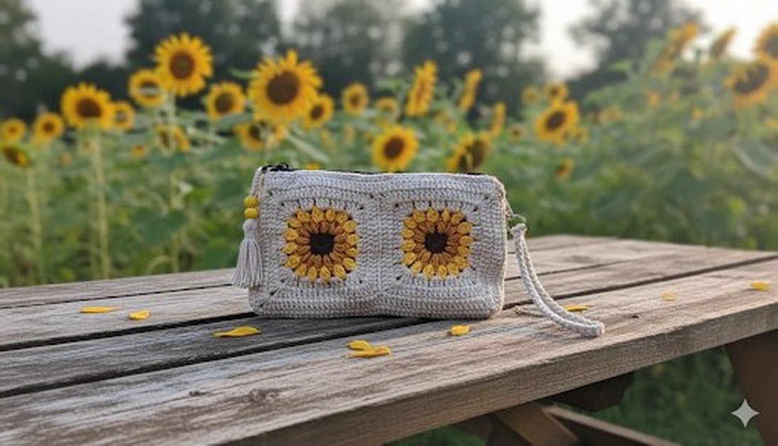 Nakışlı ayçiçeği desenleri ve püskül detaylı gri örgü bohem kadın çantası, günlük kullanım için uygundur.
